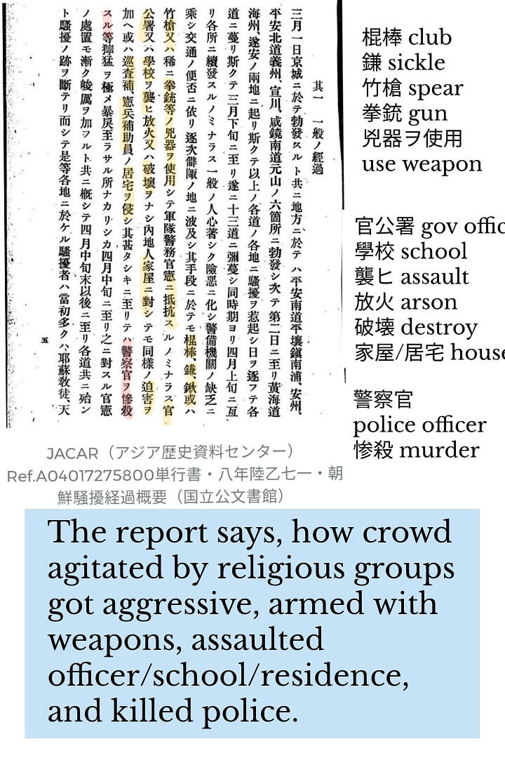 March 1st, 1919, after the death of King Kojong, Korean people were agitated by Korean religious groups and started to protest. In Japanese archive, it was recorded as 朝鮮騒擾事件(Chyou-sen Sou Jyou Jikenn), “the Korean Riots”, and it says mobs armed themselves, set fire, assaulted school and residences, and killed a police officer. After this period, there was no further riots or movement against Korean/Japanese authority.