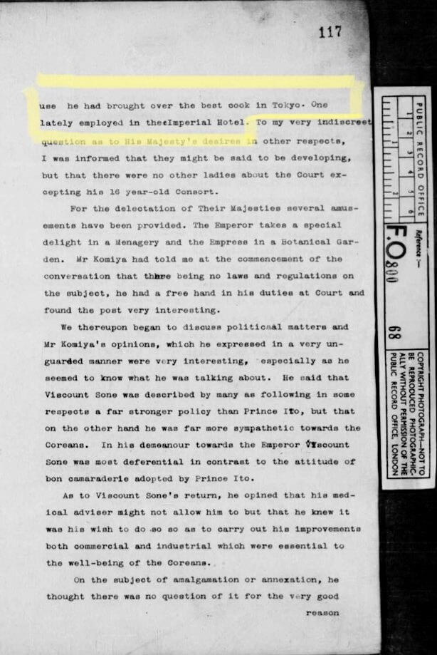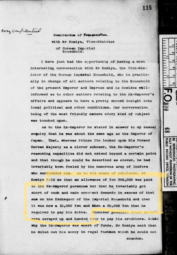 As to his means of existence, Mr Komiya told me that an allowance of Yen 300,000 was paid to the Bx-Emperor perannum but that he, invarlably got short of cash and made constant demands in excess of that sun on the Exchequer of the Imperial Household and that it was now a 10,000 Yen and then a 20,000 Yen that he required to pay his debts. Whenever possiu-were scraped up and handed over to pay his creditors. Ankad why the Ex-Eaperor was snort of funds,