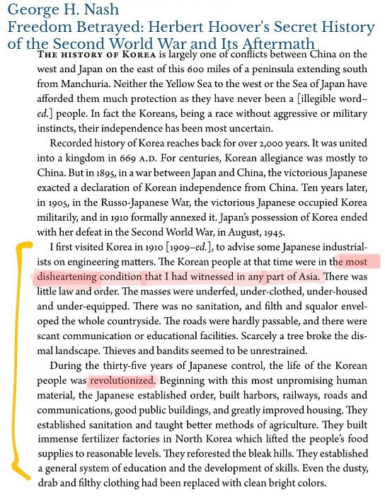 The truth is if you consider the three periods of Korea in a modern era, Japanese annexation period was the best for Korean people as described in US president Hoover described in his book "Freedom Betrayed".