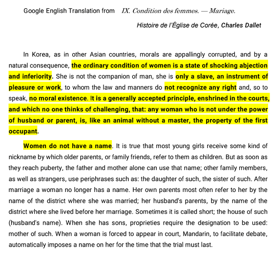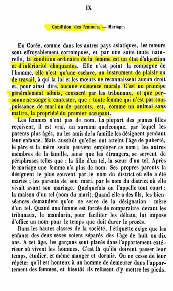Condition des femmes. - Mariage. En Corée, comme dans les autres pays asiatiques, les mœurs sont effroyablement corrompues, et par une suite toute natu-relle, la condition ordinaire de la femme est un état d'abjection et d'infériorité choquantes. Elle n'est point la compagne de l'homme, elle n'est qu'une esclave, un instrument de plaisir ou de travail, à qui la loi et les mœurs ne reconnaissent aucun droit et, pour ainsi dire, aucune existence morale. C'est un principe généralement admis, consacré par les tribunaux, et que personne ne songe à contester, que : toute femme qui n'est pas sous puissance de mari ou de parents, est, comme un animal sans maitre, la propriété du premier occupant. |