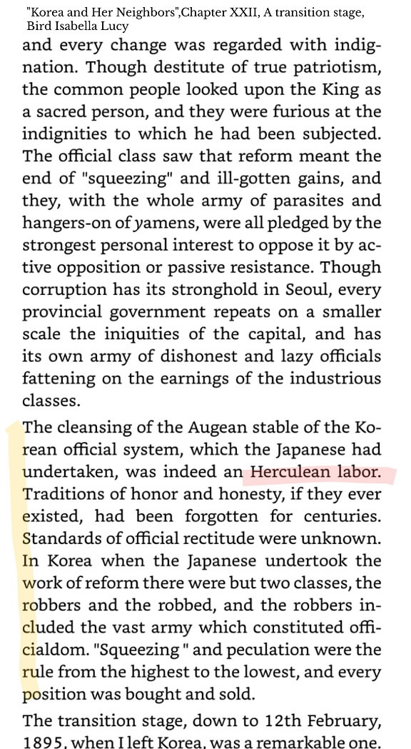 The cleansing of the Augean stable of the Korean official system, which the Japanese had undertaken, was indeed an Herculean labor. Traditions of honor and honesty, if they ever existed, had been forgotten for centuries. Standards of official rectitude were unknown. In Korea when the Japanese undertook the work of reform there were but two classes, the robbers and the robbed, and the robbers included the vast army which constituted offi-cialdom. "Squeezing" and peculation were the rule from the highest to the lowest, and every position was bought and sold.