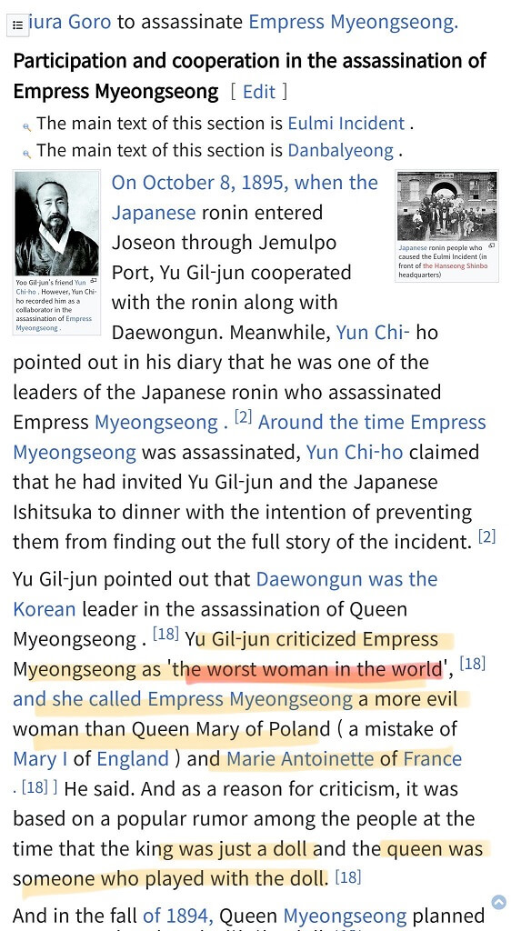 There is a myth and anti-Japanese propaganda about Korean Queen Min/Myeongseong, one of wives of Gojong(her only son was Sunjong) saying Japanese assassinated her. But this is not correct. She was killed by the fraction of king's father, who asked a fraction of Japanese to help. Strangely there is no photo identified as her.