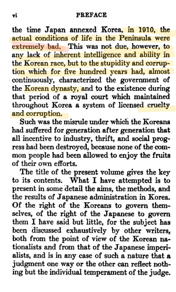 The time Japan annexed Korea, in 1910, the actual conditions of life in the Peninsula were extremely bad. This was not due, however, to any lack of inherent intelligence and ability in the Korean race, but to the stupidity and corruption which for five hundred years had, almost continuously, characterized the government of the Korean dynasty, and to the existence during that period of a royal court which maintained throughout Korea a system of licensed cruelty and corruption.