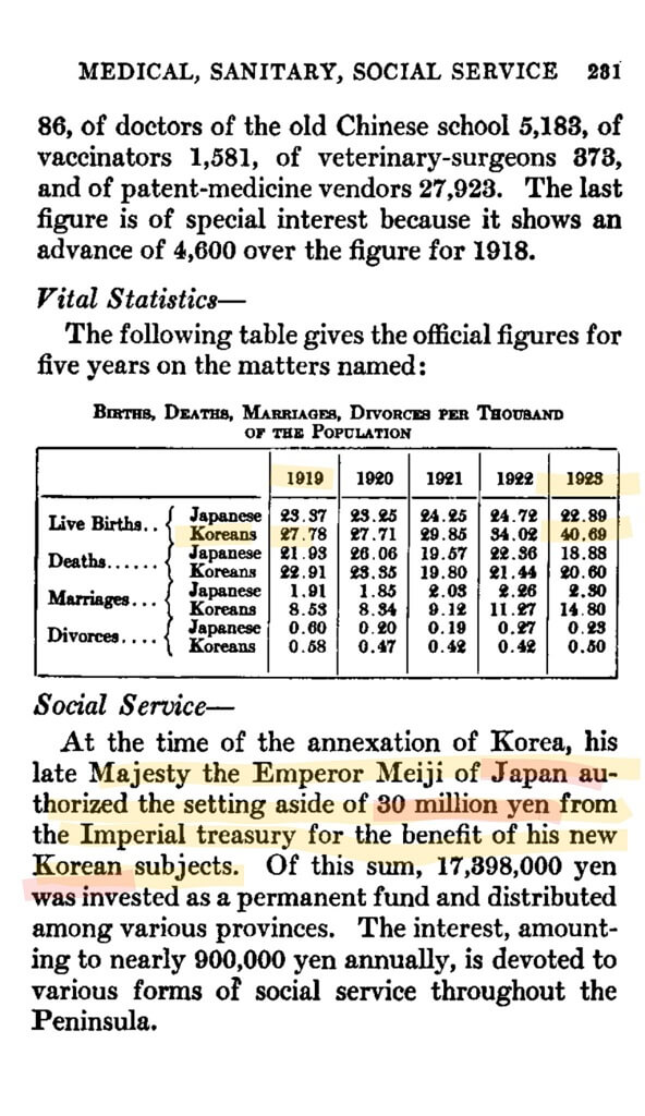 At the time of the annexation of Korea, his late Majesty the Emperor Meiji of Japan authorized the setting aside of 30 million yen from the Imperial treasury for the benefit of his new Korean subjects. Of this sum, 17,398,000 yen was invested as a permanent fund and distributed among various provinces. The interest, amounting to nearly 900,000 yen annually, is devoted to various forms of social service throughout the Peninsula.