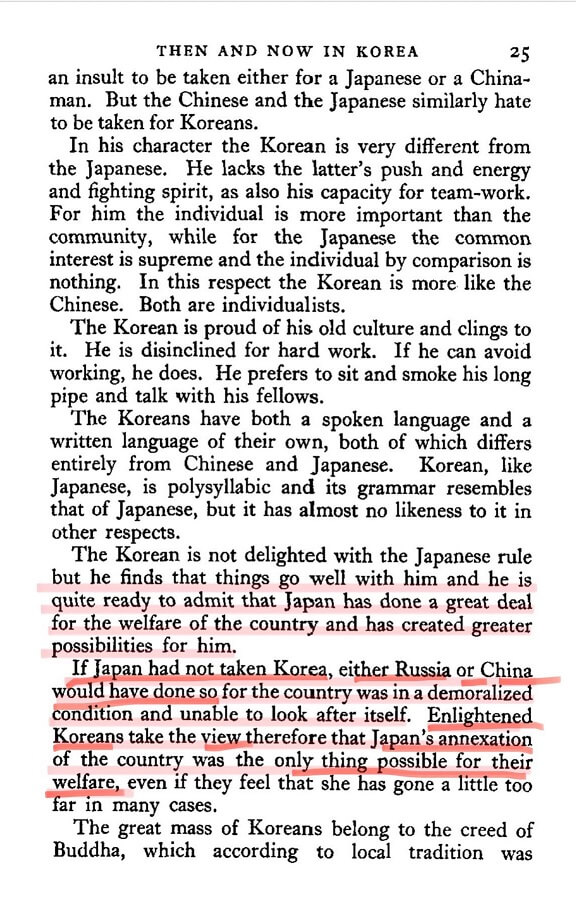 If Japan had not taken Korea, either Russia or China would have done so for the country was in a demoralized condition and unable to look after itself. Enlightened Koreans take the view therefore that Japan's annexation of the country was the only thing possible for their welfare, even if they feel that she has gone a little too far in many cases.