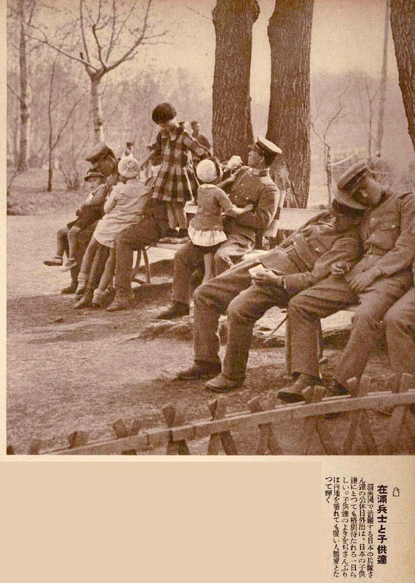 在満兵士と子供達。満洲国で活躍する日本の兵隊さん達の公休日外出は、日本の子供達にとっても格別待たれる一日らしい。子供達のよき、おじさんぶりは内地を離れても暖かい人類愛となって輝く。 Japanese soldiers and children in Manchuria. The public holiday outings of Japanese soldiers active in Manchukuo seem to be a day especially anticipated by Japanese children as well. The children's affectionate uncles, even far from home, shine with warm human love.