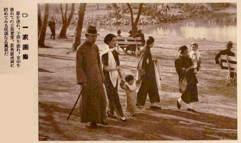 母を連れ、子供を連れ、女中を連れての公園散策、新興 満洲国に初めてみる明朗なる風景だ Taking my mother, my children, and the maid for a stroll in the park—a bright and cheerful scene I had never seen before in the newly established Manchukuo.