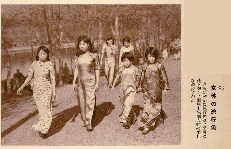 女性の流行色 きらびやかな流行色は、公園に花と咲く、満洲上流婦人達の平和な散歩すがた。 Women's Fashion Colors The dazzling fashion colors bloom like flowers in the park, the peaceful strolls of Manchurian upper-class ladies.