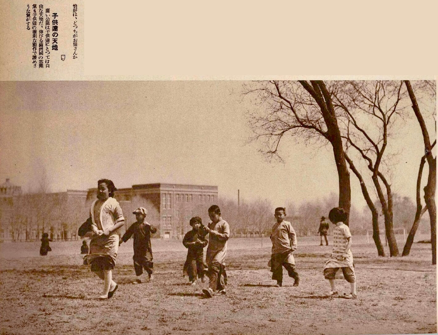 子供達の天地 広い公園は子供達にとっては自由な天地だ。伸びる満洲国の雰囲気も子供達の過剰な動作で讀めそうな気がする。 Children's Paradise The vast park is a realm of freedom for children. The atmosphere of Manchukuo spreading out seems almost palpable in their exuberant movements.
