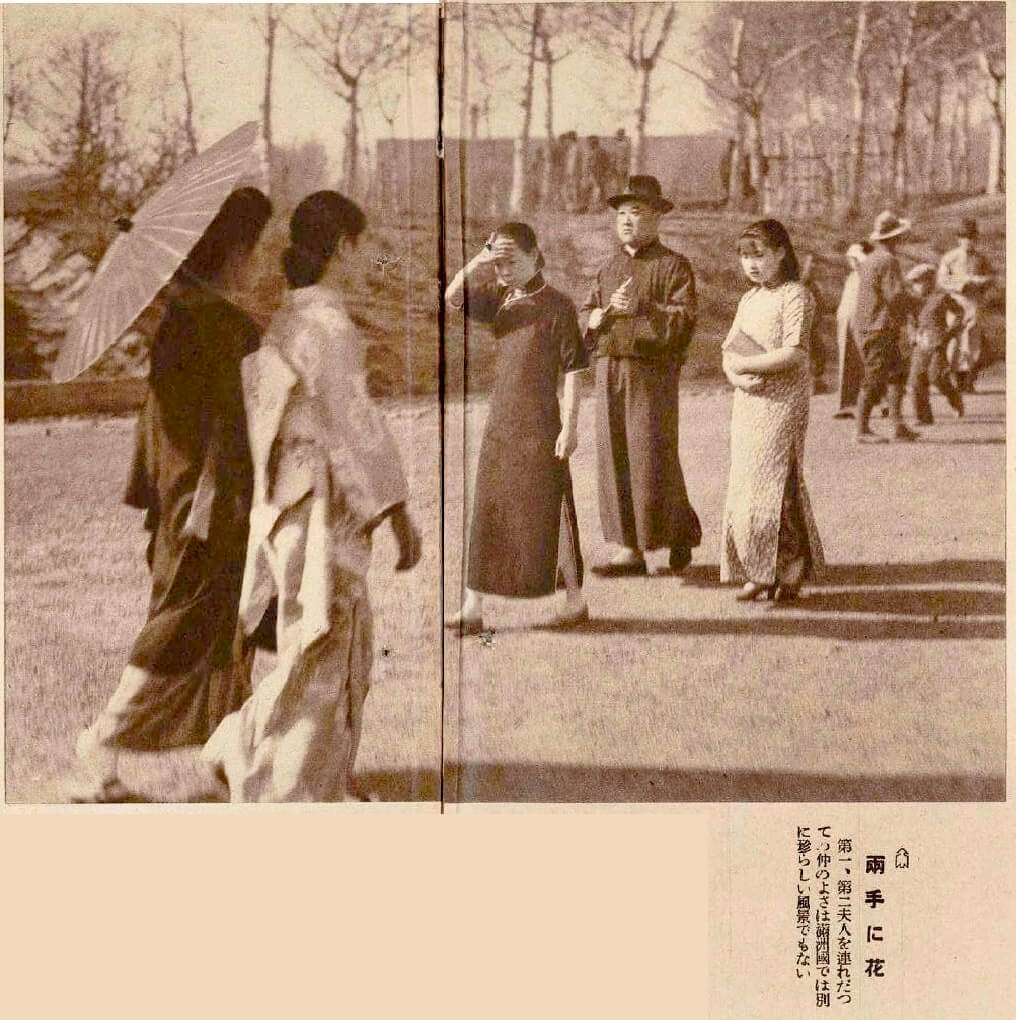両手に花 第一、第二夫人を連れだっての仲のよさは満洲国では別に珍しい風景でもない Both Wives in Tow The sight of a man accompanied by his first and second wives was not particularly unusual in Manchukuo.