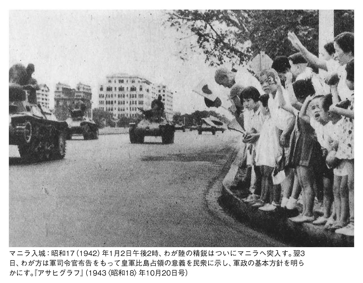(Below) Entry into Manila: At 2:00 PM on January 2, 1942 (Showa 17), our elite ground forces finally stormed into Manila. The following day, the 3rd, our side issued a proclamation by the military commander to demonstrate to the populace the significance of the Imperial Army's occupation of the Philippines and to clarify the basic principles of military administration. (Asahi Graph, October 20, 1943 issue)