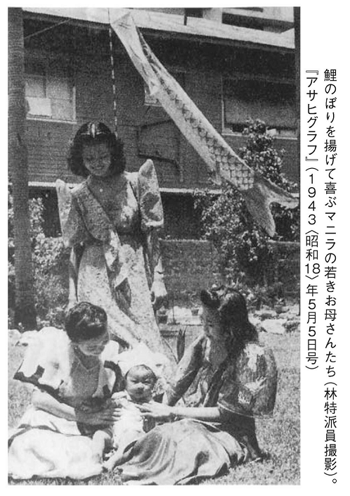 (Below) Young mothers in Manila rejoice as they raise carp streamers (Photo by Correspondent Hayashi) Asahi Graph (May 5, 1943 issue)