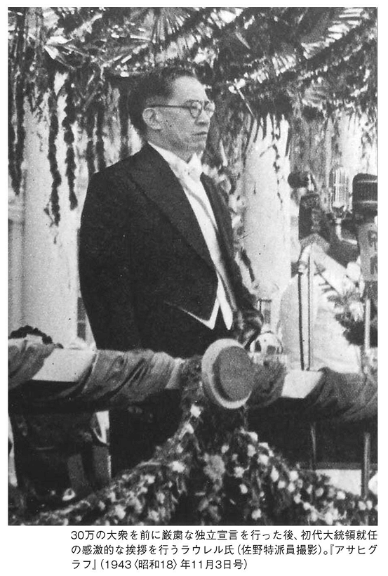 (Below) Mr. Laurel delivering his stirring inaugural address after solemnly declaring independence before a crowd of 300,000 (Photo by Sano, special correspondent). Asahi Graph, November 3, 1943 issue.