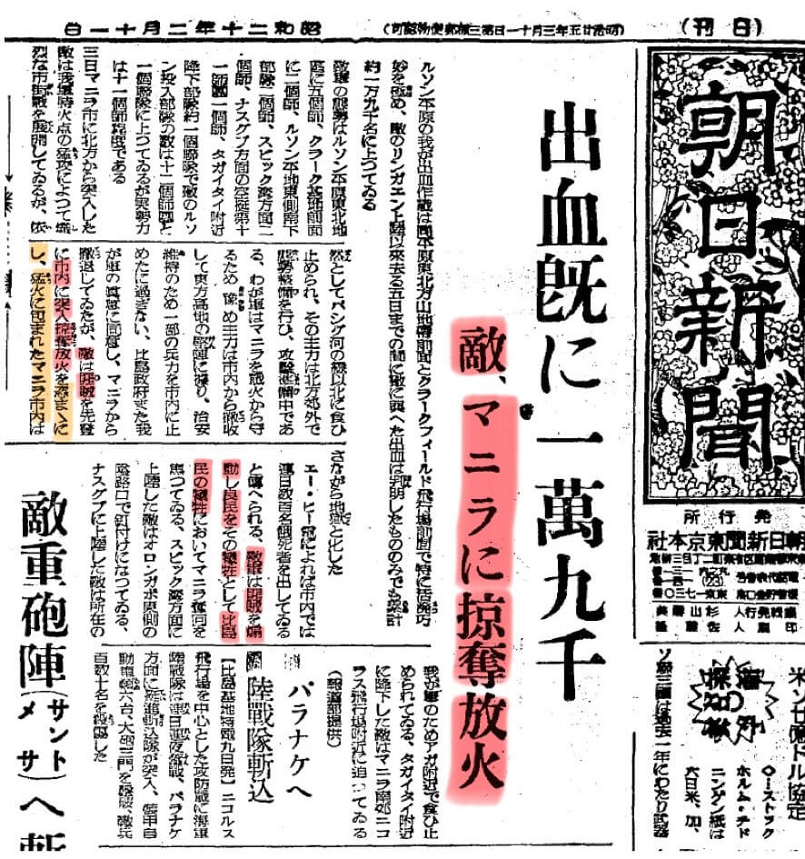 朝日新聞 1945/02/11 出血既に一万九千 敵、マニラに掠奪放火 ルソン平原の我が出血作戦は、同平原、東北方山地前面と、クラークフィールド飛行場前面で、特に活発巧妙を極め、敵のリンガエン上陸以来、去る五日までの間に、敵に与えた出血は、判明したもののみでも累計約一万九千名に上っている。 敵軍の態勢はルソン平原東北地区に五個師、クラーク基地前面に二個師、ルソン平地東側南下部隊二個師、スービック湾方面二個師、ナスグブ方面の空挺第十一師団一個師、タガイタイ付近降下部隊約一個部隊で敵のルソン投入部隊の数は十二個師団と一個部隊に上っているが、実勢力は十一個師程度である。 三日、マニラ市に北方から突入した敵は、我軍特火点の猛攻によって熾烈な市街戦を展開しているが、依然としてパシッグ河の線以北に食い止められ、その主力は北方郊外で形成装備を行ひ、攻撃準備中である。わが軍はマニラを戦火から守るため、予め、主力は市内から撤収して、東北高地の堅陣に戻り、治安維持のため、一部の兵力を市内に止めたに過ぎない。比島政府また我が軍の眞意に同意し、マニラから撤退していたが、敵は匪賊を先登に、市内に突入掠奪放火を恣まゝにし、猛火に包まれたマニラ市内は、さながら地獄と化した。エー・ピー電によれば、市内では、連日数百名餓死者をだしていると伝えられる。敵軍は匪賊を扇動し、良民をその犠牲として比島民の犠牲においてマニラ奪回を焦っている。スービック湾方面に上陸した敵はオロンガポ東側の隘路口で釘付けになっている。ナスグブに上陸した敵は、所在の我が軍のためアガ(ナガ?)付近で食い止められている。タガイタイ付近に降下した敵は、マニラ南郊ニコラス飛行場に迫っている。(報道部提供) [English Translation above] Asahi Shimbun, February 11, 1945 Enemy Casualties Already 19,000; Plunder and Arson in Manila Our bleeding operations in the Luzon Plains have been particularly active and skillful in the northeastern mountainous front of the plains and in front of Clark Field. Since the enemy landed at Lingayen, the confirmed casualties inflicted upon them up to the 5th have totaled approximately 19,000. The enemy's disposition comprises five divisions in the northeastern Luzon Plain region, two divisions in front of Clark Field, two divisions of the southern advance force on the eastern side of the Luzon Plain, two divisions in the Subic Bay area, one division of the 11th Airborne Division in the Nasugbu area, and approximately one unit of airborne troops near Tagaytay. The total number of enemy divisions committed to Luzon is twelve divisions and one unit, but their actual effective strength is about eleven divisions. On the 3rd, enemy forces advancing into Manila from the north engaged in fierce urban combat against our concentrated fire, but remain pinned north of the Pasig River line. Their main force is assembling and preparing for attack in the northern suburbs. Our forces, in order to protect Manila from the ravages of war, had previously withdrawn their main force from the city to the fortified positions in the northeast highlands, leaving only a portion of their forces within the city for security purposes. The Philippine government, agreeing with our true intentions, had also withdrawn from Manila. However, the enemy, using bandits as vanguards, stormed into the city, committing rampant looting and arson. Manila, engulfed in fierce flames, was transformed into a veritable hell. According to AP reports, hundreds are starving to death daily within the city. The enemy forces are inciting bandits, sacrificing innocent civilians in their desperate rush to retake Manila at the expense of the Filipino people. Enemy forces landed in the Subic Bay area are pinned down at the bottleneck east of Olongapo. Enemy forces landing at Nasugbu are being held back near Aga (Naga?) by our troops stationed there. Enemy forces parachuted near Tagaytay are approaching the Nicolas Airfield south of Manila. (Provided by the Press Department)