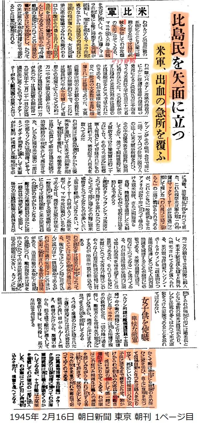 朝日新聞 東京 朝刊 1945/02/16 比島民を矢面に立つ 米軍、出血の急所を覆う わがルソン出血作戦の本格化とともに、敵は、戦線の至る所で比島民匪賊を扇動して、わが攻撃の矢面にたてている。マニラ侵入の時も、匪賊を先頭に潜入し、それに続くマニラ市街戦にも敵に呼応する匪賊が跳梁し、盛壯を極めるマニラ市街戦のなかから比島民の骨肉相食む地獄の相が伝えられる。大東亜戦争以来、各戦場でみられた敵のやり口から、敵がその最も恐れる出血の急所を比島民の犠牲によって補わんとしていることは明らかで、今後戦局の進展につれてこの比島民の犠牲をさらに大規模化にし、かつての米比軍の本格的再建にまで進めることは当然予想される。わが軍のバターン攻略の時、数万に上った捕虜は当時の現地軍の発表によると、総数五万三千四百で、うち米兵は、九千五百三十三名に過ぎなかった。この数字が示す比島兵と米兵の割合は、当時の比島戦線至るところで見られたのである。わが攻略軍が戦火を交えた敵兵の大多数は米兵に指揮された比島兵であった。大東亜戦争直前の陸軍約五千で、これに比島兵約六千が土民軍として直接その指揮下に入って、この約一万一千が米比軍の基幹となり、ほかに比島陸軍の正規兵約一万があった。比島陸軍の創設は一九三五年十二月二十一日の比島国防法に基づくもので、マッカーサーが米人顧問団の主席となり、ケソンが、その総司令官で年に二回、二万人づつ計年に四万人の壯丁に米式軍事教練を行い、その中の優秀者を正規兵に採用していた。従って、開戦当時に米式軍教をうけた予備群は、約二十万に上り、そのうち正式に在郷軍人会員として登録されたものは、兵約十万、将校四千八百名を数えていた。 わが軍は比島兵捕虜のなかから優秀者を選抜して、日本式再訓練を施して、警察官を養成し、卒業者を全比島に配置して、新生比島共和国の治安維持の中核体として再生させた。しかるに、残存米比軍の一部は、中北部ルソンの山岳地帯、ビサヤ、ミンダナオ地区に遁入して米軍が計画的に残置した諜報班を中に通報、治安攪乱行為を行って来た。これら残存米比軍の唯一の希望は、マッカーサーが比島逃亡に際して残した、「われ再び比島に還らん」の一語に繋がるものであるが、これとともに一般民衆もまたアメリカが数十年に亙って植えつけた親米感情、さらに開戦後も、「食糧、繊維製品を満載した大船団とともにやがて我等は比島を訪れるであろう」と躍起のサンフランシスコ放送によって呼び掛けを忘れなかったことによって、陰に陽に、その胸に親米感情をもっていたものが多いという事実を軽視してはならない。マッカーサーの軍がルソン平原を南下し、マニラ攻防戦がいまや酣である今日、残存米比軍の存在と一般民衆に潜在する親米感情は、敵にとって比島民扇動と米比軍再建への絶好の手がかりとなる。敵は膨大な産業動員のほかに、第一線兵員の補充に漸く困却し、後方の非戦闘勤務の兵員を月平均一万の割合で歩兵部隊に編入し、米本土駐屯兵も続々と海外へ補充されていると伝えられる。米の軍事評論家ハンソン・ボールドウィンも「総体的かつ、長期の見通しをつけて、人的資源問題を処理することが絶対に必要である。米軍の損害は過三、四万に上がっている」と述べている。わが出血作戦が、米国内に測り知れぬ恐怖を巻き起こすことは当然であるが、それよりも更に、米軍にとっては大きな打撃は、このような人口資源問題の実相に対するわが出血作戦の斬込みである。 わが矛先を比島民の犠牲によって防ぐことは、米軍の喫緊の戦法である。敵がすでにルソン島に注ぎ込んだ兵力は、十一個師団余であるが、わが出血作戦の矢面には、このほかに、米軍に扇動される多数の比島民があり、出血作戦の本格化と戦局の進展につれ、敵が残存米比軍を中心に、かつての米比軍再建の挙に出る可能性は大きい。ルソンに敢闘するわが精鋭の前には敵米兵とともに多数の親米比島民があり、しかも彼等の多くは、かつて米式軍教をうけた軍隊であることを忘れてはならない。 女子供を使嗾 卑劣な敵軍 【ルソン前線報道班員十五日発】今や敵の砲撃により、大半廃墟と化したマニラ市は、至る所、焼け残りの鉄骨が立ち、一切の緑は姿を消し、敵味方とも飲料水の欠乏に苦しみながら、砲煙と汗にまみれ、息づまる死闘を展開している。 うづ高く廃墟のかげに隠された敵地には、なお、わが将兵の銃剣と鋭い目がらんらんと燃え、鉄骨のかげから、廃墟の中から、至る處で敵中に潜入して敵を斬り殺し、射ち殺し、甚大な出血を強要する。かくて敵は卑怯にも盲爆のため住むに家を失い、食うに食糧を失って、自暴自棄となった比島人をかり立て、甚だしいのは無理じいに、女子供に至るまで、銃をとらせ、物からわが斬込みの将兵を狙撃させ、或いは米軍の楯として、第一線に弾防ぎにかり立てている。わが軍は、この狂った無残な比島人の