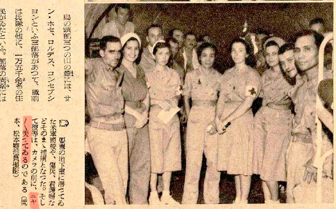 島の頭部三つの山の麓には、サン・ホセ、ロルデス、コンセプションといふ三部落があって、戦前は兵隊の他に、一万五千余名の住民がいたという。部落の周囲には、、、。 要塞の地下室に潜んでいた米軍将校や、傷兵、看護婦などそのまま捕虜となった。そして彼等は、カメラの前に、ニヤニヤ笑っているのである(岡本、松本特派員撮影) (Translation) At the foot of the island's three main mountains lie the three villages of San Jose, Lourdes, and Conception. Before the war, besides the soldiers, there were said to be over fifteen thousand residents. U.S. military officers, wounded soldiers, nurses, and others who had been hiding in the fortress's basement were taken prisoner. And there they were, grinning before the camera. (Photographed by Special Correspondents Okamoto and Matsumoto) |