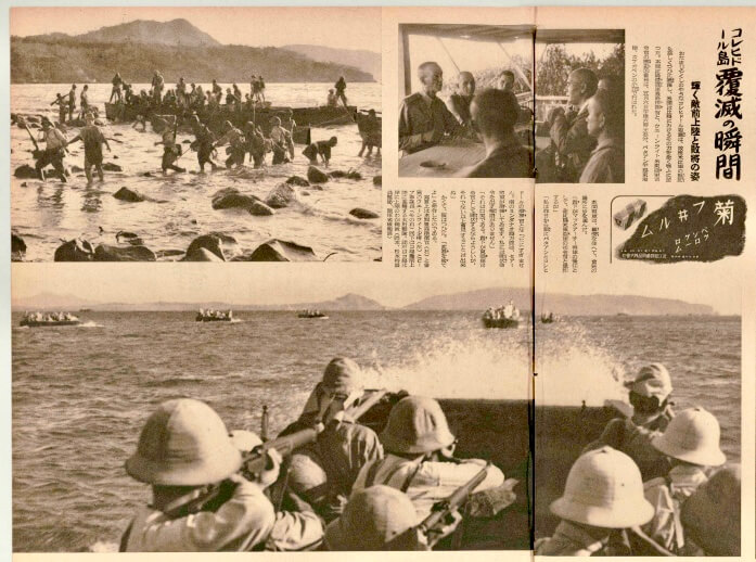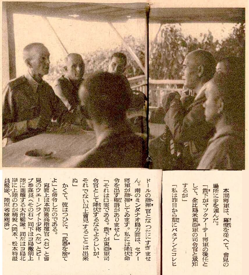 本間将軍は、幕僚を従えて、会見の場所に歩を選んだ。「貴下がマッカーサー将軍の後任として、全比島米東亜軍の司令官と承知するが」 「私は昨日から単にバターンとコレヒドールの指揮官となったにすぎません。南のミンダナオ島方面は、セアー將軍が指揮しています。私には降伏命令を出す職限がありません」 「それは口実である。貴下が東亜軍司令官として降伏するならよろしいが、それでない以上、会見することは出來ぬ」 かくて、彼はつひに「武器を捨てよ」と命令したのである。 写真上は本間最高指揮官(右)と会見のウェーンライト少将(左)とビープ参謀長(その右)同下はコレヒドール島北岸に上陸のわが精鋭(岡本、松本特派員撮影、陸軍省検閲済) (Translation) General Homma, accompanied by his staff, chose to walk to the meeting place. “I understand you have succeeded General MacArthur as Commander of the U.S. Forces in the East Asia Command throughout the Philippines.” “Since yesterday, I have merely assumed command of Bataan and Corregidor. General Shearman commands the southern Mindanao sector. I lack the authority to issue a surrender order.” “That is an excuse. If you surrender as Commander of the Army of the East Asia, that is acceptable. Otherwise, I cannot proceed with this meeting.” Thus, he finally ordered, “Lay down your arms.” Top photo: Supreme Commander Honma (right) meeting with Major General Weihlright (left) and Chief of Staff Beep (to his right). Bottom photo: Our elite troops landing on the northern shore of Corregidor Island (photographed by correspondents Okamoto and Matsumoto, censored by the Army Ministry). |