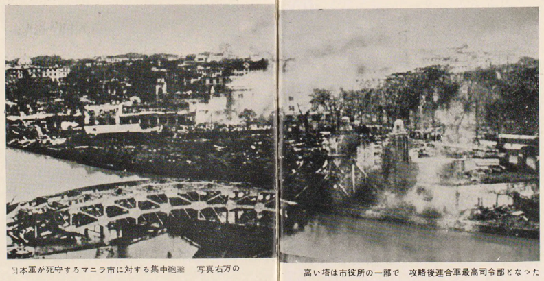 日本軍が死守するマニラ市に対する集中砲撃。写真右方の高い塔は市役所の一部で、攻略後、連合軍最高司令部となった。