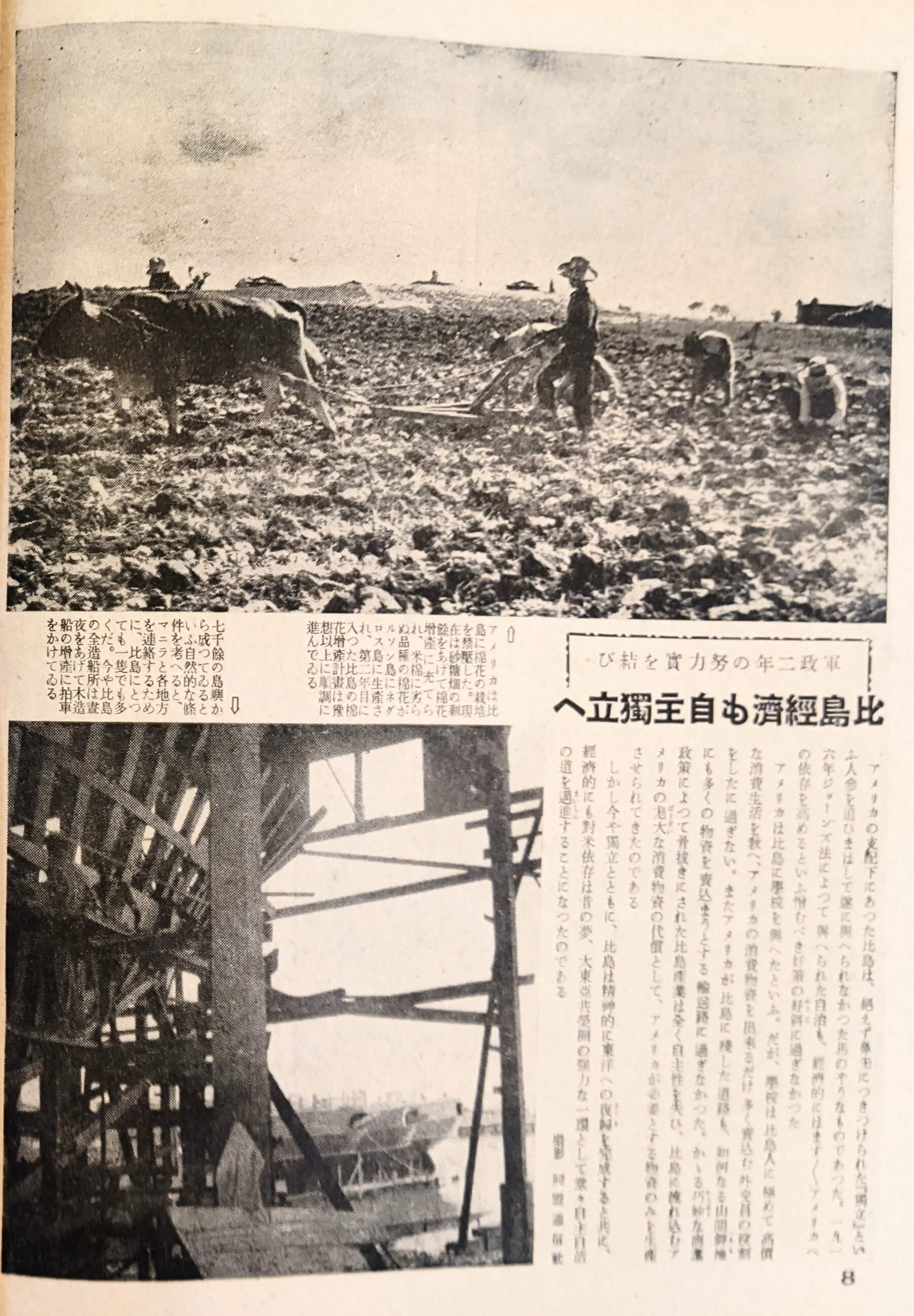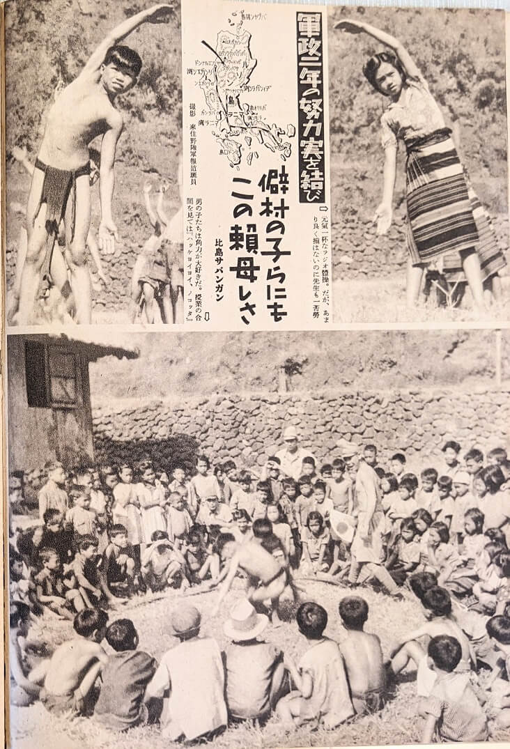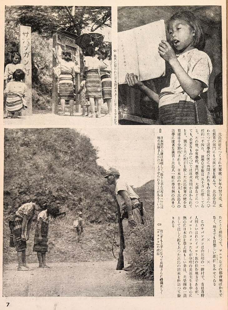 (Below) [Top Right] 街角に貼られた日本語ポスターに見入る少女たち [Top Left] 日本語の上達は素晴らしく、餘り上手な『今日ハ』に現地の兵隊さんがはっとされることがあるという。 [Left Bottom] おじぎも上手になって兵隊さんに行儀正しく『サヨナラ』の挨拶。 比島再建につくされた軍政二カ年の努力は、文化教育の部門にも立派に實を結んで、比島全体にわたって諸学校の既に再開されたもの公私立小学校約1千四百、就学児童数は五十万に達している。この地、中等学校、専門学校、大学などについても、必要なものについては逐次再開がはかられており、独立と共に舊套(きゅうとう)を脱した比島教育の健全な発達は十分期待される。日本語の普及も比島人の語学に達者な素質と比島人一般に学習熱の高まったことと相俟って、マニラなどの都会地ばかりでなく、地方でも目覚ましい進捗をみせている。 このサバンガンは山岳郷の一村で、昔は首狩り人種といわれたイゴロト族の住む地であるが、イゴロトのヨイコたちが分哨の兵長先生を中心に熱心に日本語を学ぶ頼みしい姿は、共栄圏の一員として逞しく起ち上がった比島の将来を物語って餘りある。 [Top Right] Girls intently studying Japanese posters posted on street corners [Top Left] Their Japanese skills have improved remarkably, and local soldiers are sometimes startled by their surprisingly fluent “Kon nichi wa” greetings. [Left Bottom] Their bows have also improved, and they politely greet soldiers with “Sayonara.” The two years of military administration dedicated to Philippine reconstruction have borne splendid fruit in the cultural and educational sectors. Across the Philippines, approximately 1,400 public and private elementary schools have already reopened, with the number of enrolled children reaching 500,000. Regarding secondary schools, vocational colleges, and universities in this region, necessary reopenings are being arranged sequentially. With independence, the sound development of Philippine education, shedding old conventions, is fully anticipated. The spread of the Japanese language, aided by Filipinos' innate aptitude for languages and the heightened enthusiasm for learning among Filipinos in general, is showing remarkable progress not only in urban areas like Manila but also in the provinces. This village of Sabangan lies in a mountainous region, once home to the Igorot tribe known in the past as headhunters. Yet the sight of the Igorot youths diligently learning Japanese under the guidance of Sergeant Major, the detachment commander, speaks volumes about the future of the Philippines rising robustly as a member of the Co-Prosperity Sphere.