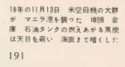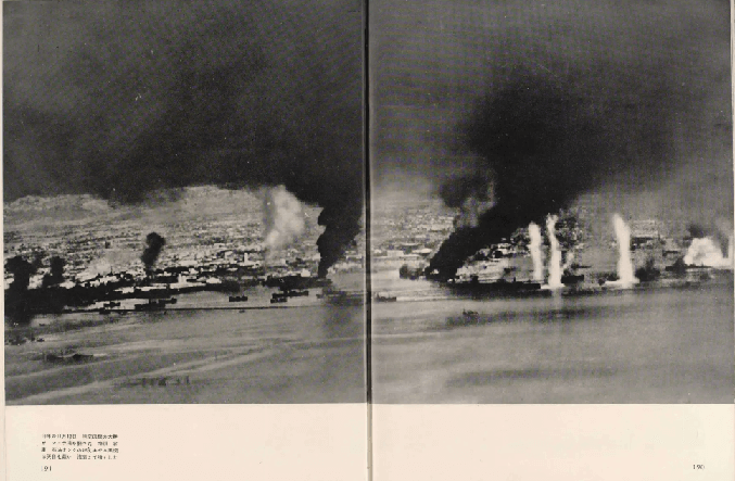 (昭和)19年の11月13日 米空母機の大群が、マニラ港を襲った。埠頭、倉庫、石油タンクの燃え上がる黒煙は天日を蔽い、海面まで暗くした。 November 13, 1944 A massive fleet of U.S. carrier-based aircraft attacked Manila Harbor. Black smoke billowing from the burning docks, warehouses, and oil tanks obscured the sun and darkened the sea surface. ![]() |