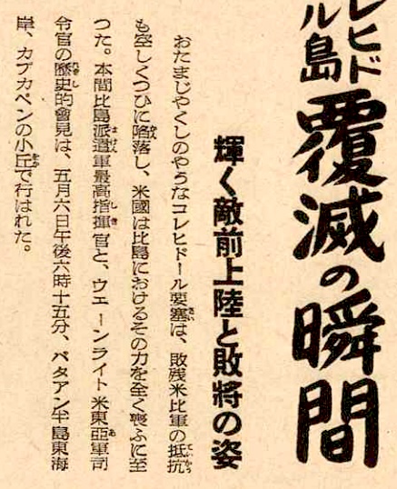コレヒドール島、覆滅の瞬間 輝く敵前上陸と敗将の姿 おたまじゃくしのやうなコレヒドール要塞は、敗残米比軍の抵抗も空しく、ついに陥落し、米國は比島におけるその力を全く喪うに至 つた。本間比島派遣軍最高指揮官と、ウェーンライト米東亜軍司令官の歴史的会見は、五月六日午後六時十五分、ベタアン半島東海 岸、カプカペンの小丘で行はれた。 (Translation) Corregidor Island: The Moment of Annihilation The Glorious Landing Before the Enemy and the Figure of the Defeated Commander The tadpole-shaped Corregidor Fortress finally fell, despite the futile resistance of the defeated American and Philippine forces. The United States thus completely lost its power in the Philippines. The historic meeting between General Homma, Supreme Commander of the Japanese Expeditionary Force to the Philippines, and General Wainwright, Commander of the U.S. Forces in East Asia, took place at 6:15 PM on May 6th, on a small hill at Capucapén on the eastern coast of the Bataan Peninsula. |