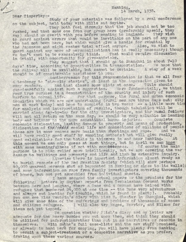The letter below from Bates on 14th March in 1938 to Timperley. The letter was written in implicit way but basically it is about Bates using Timperley to spread anti-Japanese propaganda to the world. Also Bates saying “40K burial record by Red Swastika is unarmed” is groundless or misleading. The truth is only 0.3 percent of 40K bodies is female/children, and the rest is possibly Chinese ”soldiers" (See Burial Record ). But the similar pathage appears in Timperley's book.