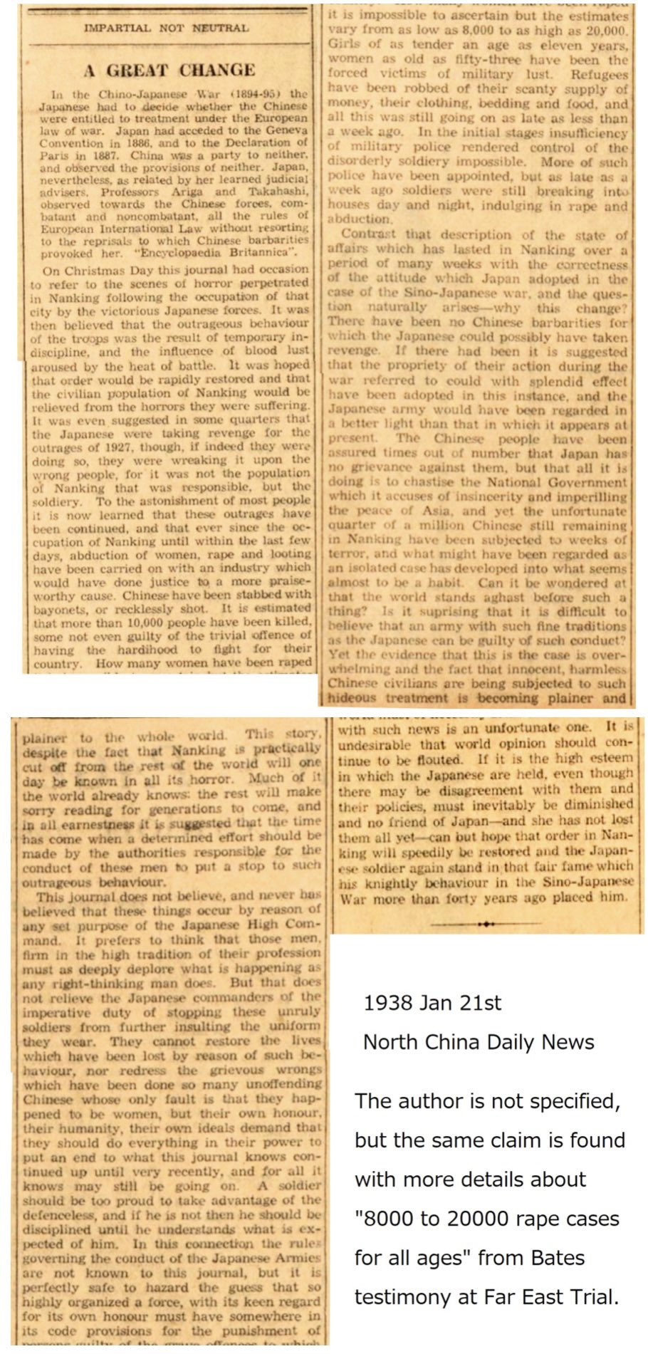 If any massacre to Chinese by Japanese had occurred, Republic Of China, Chiang kai-shek should be the first person raising his voice and accusing Japan for its crime. Oddly, Chiang's first mention of Japanese killing people in Nanking appeared on Jan 21st on his dairy, which is the next day of this mysterious post on North China Daily News. The description of 8000 or 20K rapes(almost impossible as explained later) is what Bates has been saying at Tokyo trial too. In other words, Bates as KMT advisor made up Nanking massacre and told its story to Chiang. Therefore, Nanking massacre was not made up by Chinese Chiang, nor communist Mao who never mention Nanking massacre, but AMERICANs.