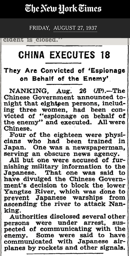 It started from the book, “What War Means” (1938) below written by Australian journalist, Harold John Timperley. This is anti-Japanese propaganda book, which also was translated into Chinese. After WW2, Nanking Tribune court held by Chinese KMT, sentenced to death to these Japanese soldiers.