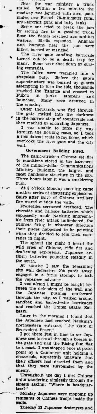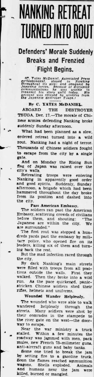 内閣情報部一二・一八 情報第一一号 A・P南京日本兵の行動を誣ゆ 同盟来電 不発表 ニユーヨーク十七日(A・P) A・P南京特派員マクダニエル氏は南京陥落直後の情況を日誌の形で左の如く報じている。 十二月十四日 入城した日本軍が全市に亘つて掠奪を行ふのを見た。 一日本兵は安全地帯に避難していた住民に銃剣を擬して、三千弗をせしめたのを目撃した。 十二月十五日 米国大使館の傭女と共に彼女の母親を探しに出かけた処母親は溝の中で無惨な死体となつて発見された。 午後余自身も武装解除を手伝つた支那兵数名が屋外に引摺り出され銃殺に処せられた上溝の中に蹴こまれた。 夜一般民及び武装解除された支那兵五百名以上は日本兵により安全地帯から何処ともなく連れ去られた。勿論一人も帰って来たものはいなかった。支那住民は軒に日章旗を掲げ帽子に日の丸をつけていても、次々逮捕され引っ張られていく。 ![]() |