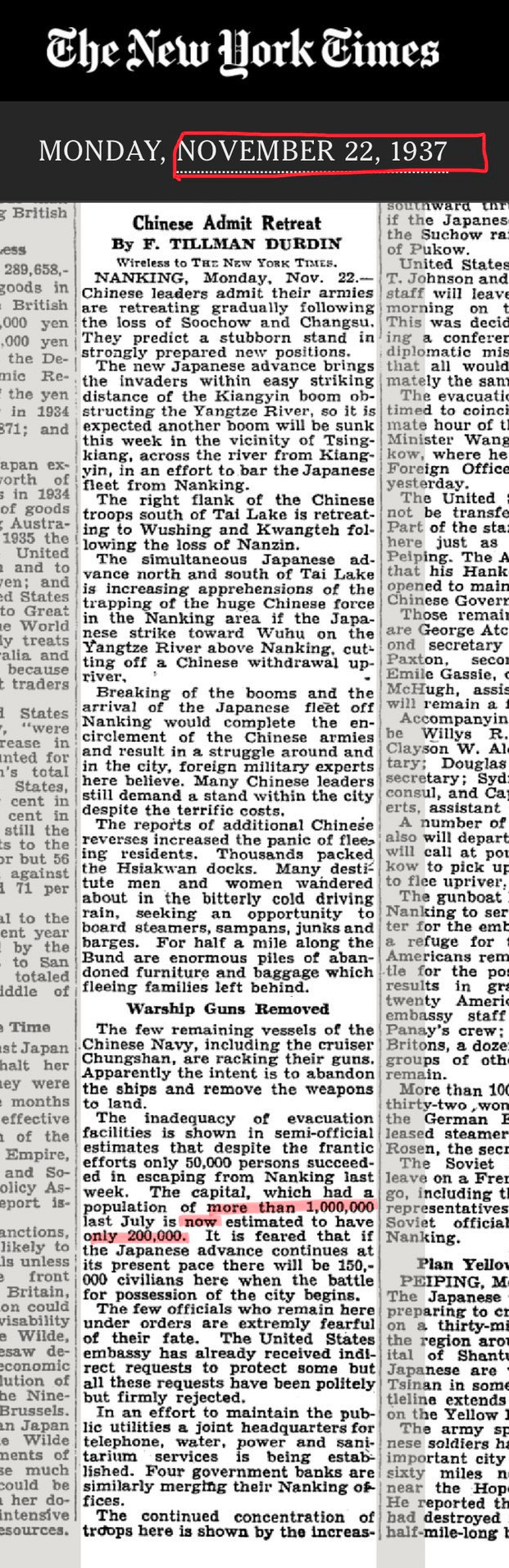 New York Times, Durdin says there were more than 1000K at the capital Nanking, but now only 200K remained on November 22 in 1937, one month before a battle(Dec 13th).