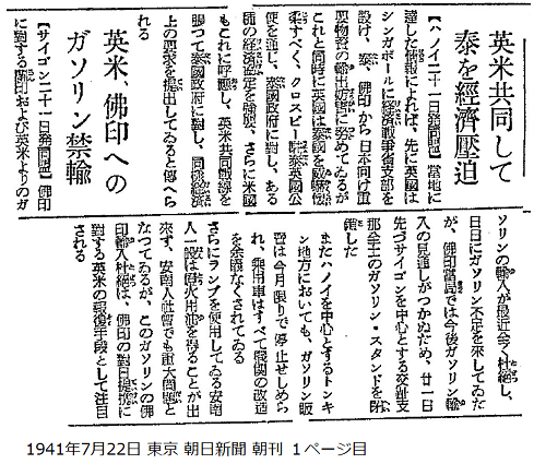 1941/7/22 Asahi Newspaper The United Kingdom and the United States Jointly Pressurize the Economy of Thailand (Hanoi, Feb. 21, Doumei news report) According to local information, the British have established a branch of the Ministry of Economic Warfare in Singapore to obstruct the export of important goods from Thailand, France, and India to Japan. The U.S. and Britain are reported to have joined forces to make the same economic demands of the Thai government. British and U.S. Embargo on Gasoline to French Indochina (Saigon, 21th Doumei news report) The import of gasoline from France and India, as well as from the U.K. and the U.S., has recently been completely cut off, and gasoline shortages are increasing day by day. In the Tonkin region centering on Hanoi, gasoline sales have also been suspended until the end of this month, and all passenger cars have been forced to have their engines modified. Furthermore, Annamese (安南人) who use lamps are unable to obtain oil for lighting their lamps, which has become a serious problem in Annamese society, and the suspension of French and Indian imports of gasoline has attracted attention as a retaliatory measure by the UK and US against the French Indochina alliance with Japan. |