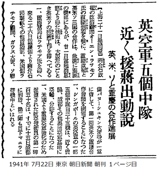 1941/07/22 Asahi Newspaper Nearly Five Squadrons of British Air Force Reportedly Dispatched to Aid Chiang Cooperation Progressing Between Britain, U.S., Soviet Union, and Chongqing (Shanghai, 21st, Doumei report) With the arrival in Chongqing of Owen Lattimore, political advisor to the Chiang Kai-shek administration, cooperation between the Chongqing government and the three nations of Britain, the United States, and the Soviet Union is rapidly gaining momentum. Information obtained from sources on the 21st indicates the following British, American, and Soviet efforts to aid Chiang Kai-shek: 1. On the 26th, when Latimore arrives, the Chongqing authorities will convene the first British-American-Soviet-Chongqing Cooperation Conference. Attendees will include Chiang Kai-shek, Guo Qinqi, and other top officials from the Chinese side; Advisor Latimore and Ambassador Gauss from the American side; and Ambassador Panushkin(Alexander Panushkin) from the Soviet side. 2. A portion of the British Air Force in Singapore, consisting of five squadrons totaling 135 aircraft, will soon be airlifted and deployed to air bases in Guiyang, Chengdu, and other inland locations. 3. The first group of 150 aviation technicians dispatched from the United States to strengthen the Chongqing Air Force has already arrived in Chengdu. The second group is reportedly currently awaiting instructions in Manila. |