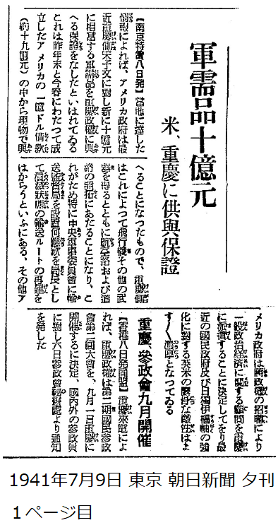 1941/7/9 Asahi Newspaper Billions of Yuan in Military Supplies Provided to Chongqing by U.S. Nanjing Special News Agency, August 8 According to information reaching this office, the U.S. government has recently assured Chongqing's T. V. Soong that it will provide the Chongqing administration with military supplies worth 1 billion yuan. The U.S. loan of 100 million dollars (about 1.9 billion yuan), which was approved at the end of last year and this spring, is to be given in kind, and the Chongqing side will use it to acquire airplanes and other weapons and to develop air routes and roads. He Yingqin, the director of the bureau, was to rebuild the devastated transportation routes. The U.S. government also decided to dispatch a general political and economic advisor to Chongqing at the invitation of Chiang Kai-shek. The overt hostility of Britain and the U.S. toward the Nationalist government (Wang Jingwei?) and the strengthening of the Japanese-German-Italian Axis was becoming more and more intense.