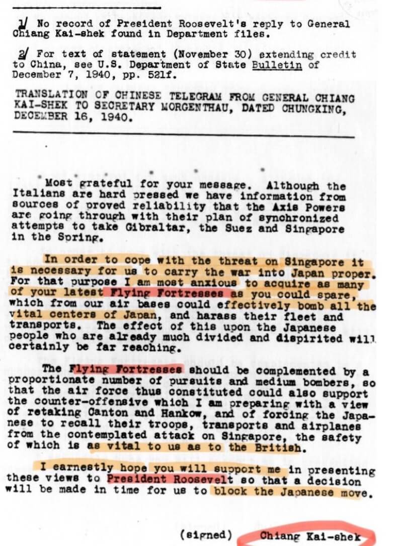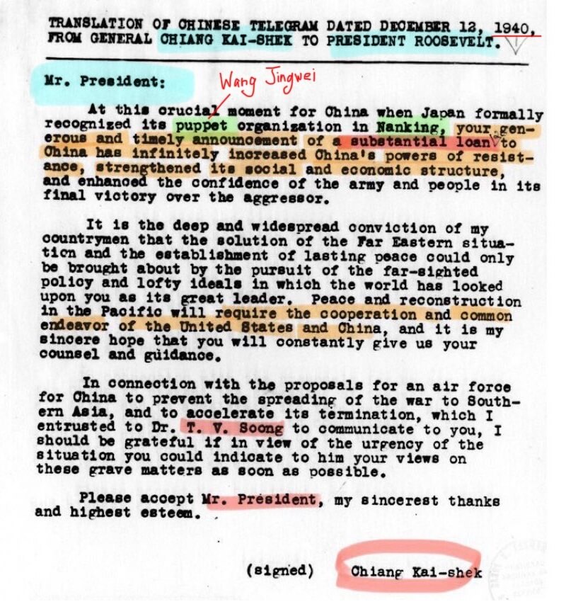 (Below) Whining Chiang kai-shek sent a letter to FDR complaining about Wang Jingwei Nanking government calling it Japanese puppet (Chiang is the puppet of FDR) and asking for a further economic and military aid, which later FDR did, supporting Chiang even further and demanding Japan to deny Wang Jingwei and support only Chiang with Ultimatum.