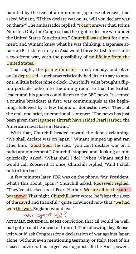 FDR and Churchill had met on 14th August 1941 at Atlantic Charter, and Churchill desperately wanted the US to join a war against Germany, but FDR couldn't give him a good response. But finally their plan worked. After hearing the attack on Pearl harbor by Japanese, not Germany, Churchill got happy and even convinced now he won the battle. And FDR replied “we are all in the same boat now”.