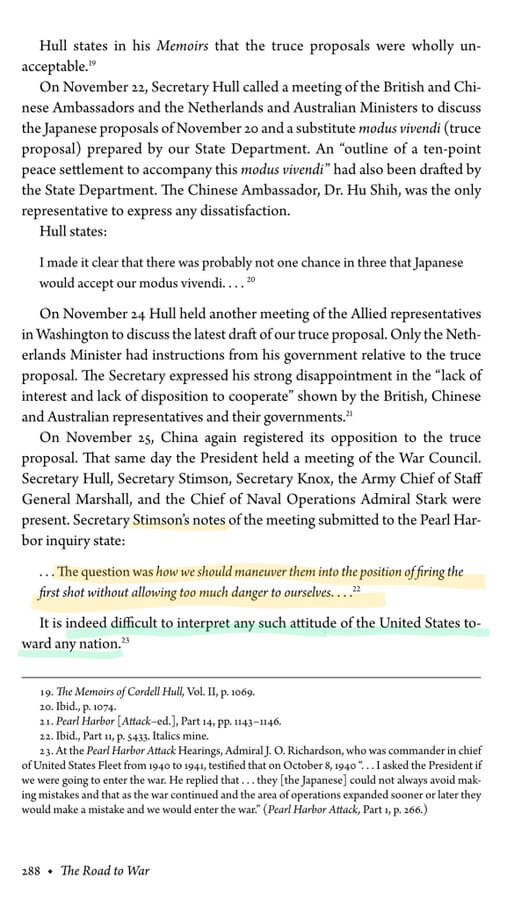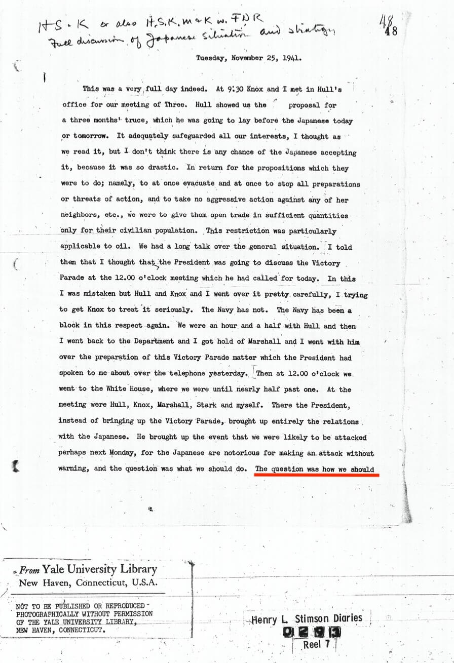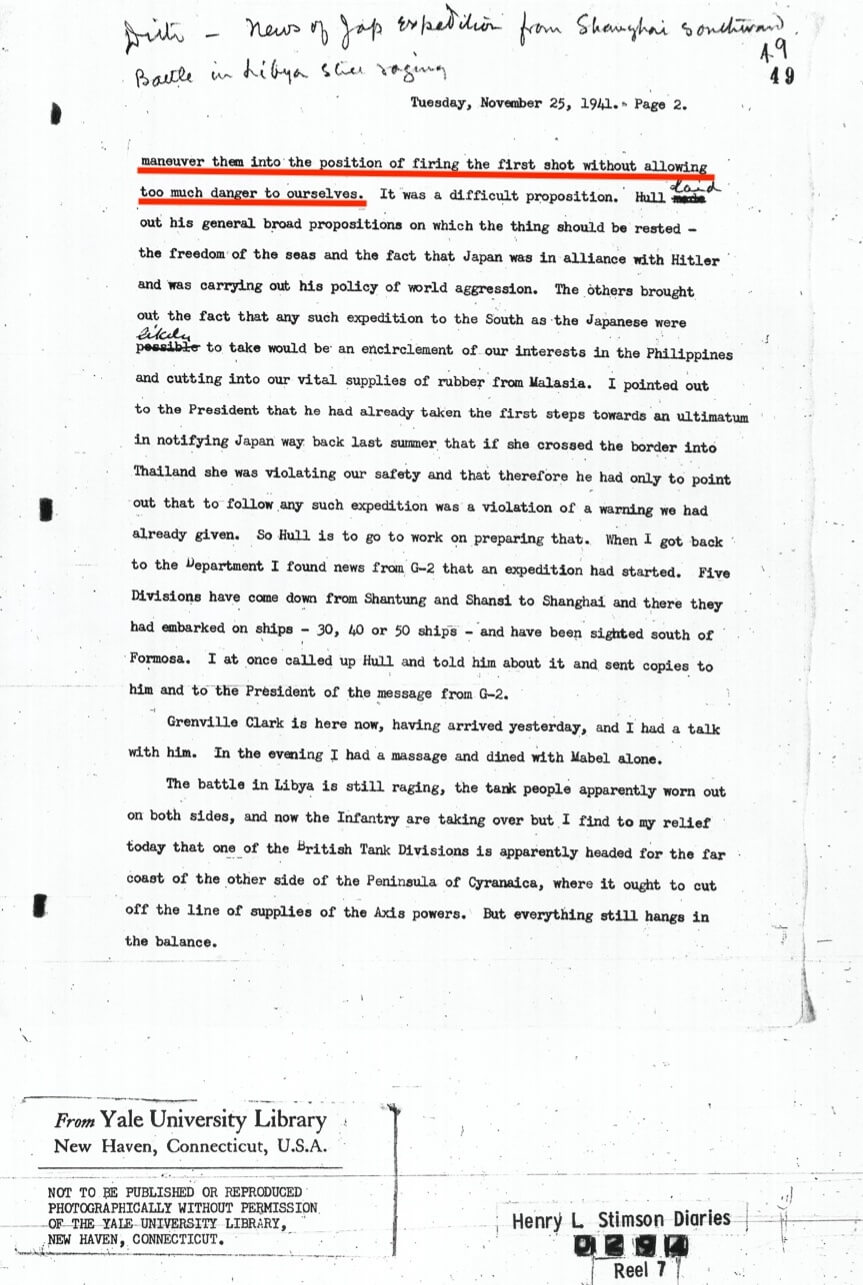Henry L. Stimson's diary saying “The question was how we should maneuver them into the position of firing the FIRST shot without allowing too much danger to ourselves” on November 25 in 1941 which is one day before Ultimatum(Hull note) was delivered to Japan on November 26 by Hull.