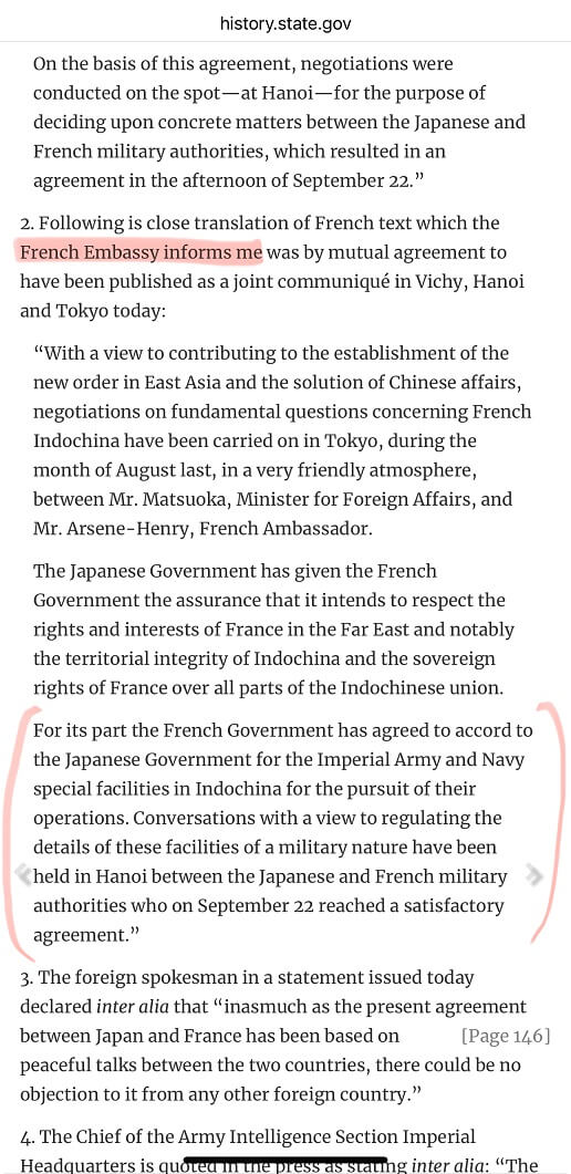 Some people attempt to justify US provoking Japan by saying Japan invaded French Indochina first since 1940. This is not correct. Japan was at 2nd Sino-Japanese war, and needed to cut off an aid pipeline over Indochina to Chiang kai-shek from outside. Indochina was a colony of France with Paris Peace Treaty, therefore Japan negotiated with French Vichy government and French agreed on Japanese military staying there. Some still say Vichy is controlled by Germany and not invalid, but that is not a problem of Japan.