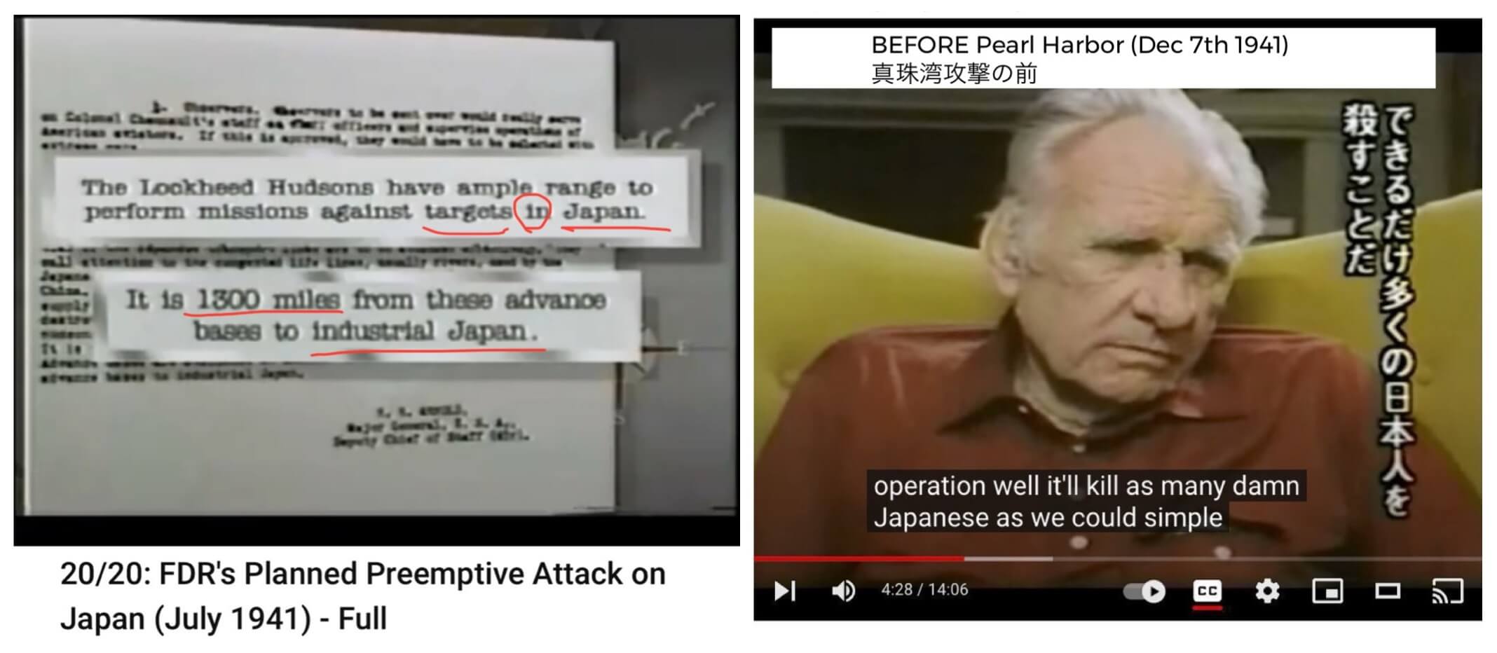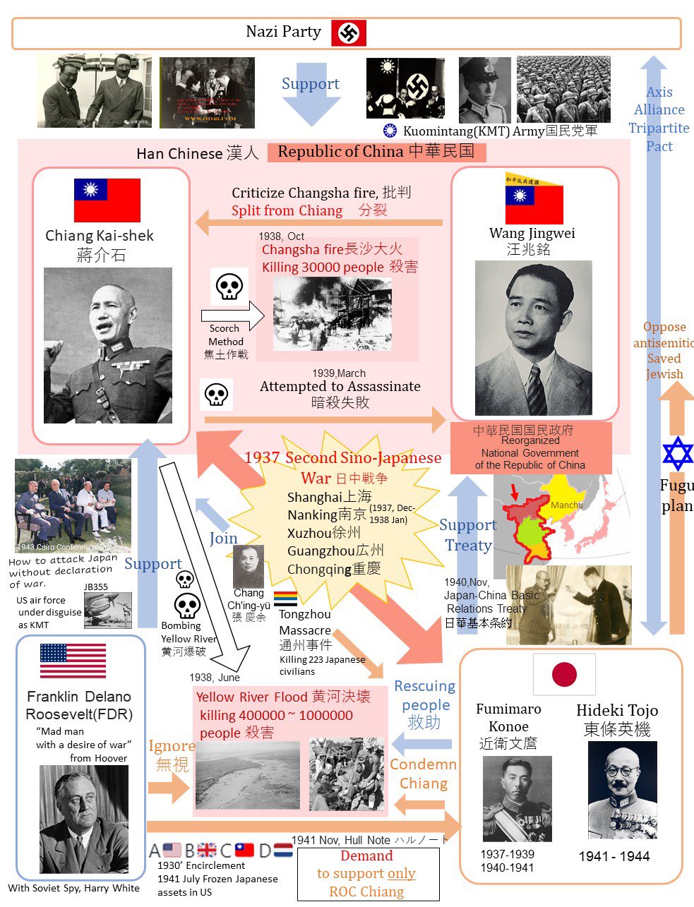 Summary FDR and Stimson were not into helping Jewish but wanted to save Churchill from Germany, but they couldn’t because of anti war US isolationists such as Charles Lindbergh. Back then even a few months before Pearl Harbor, the majority of Americans was against the immediate war against Germany. (Ref: Those Angry Days by Orson.) Therefore FDR used Japan, “Back door to war” as Stimson’s diary says “The question was how we should maneuver them into the position of firing the FIRST shot without allowing too much danger to ourselves”. (Ref: Freedom Betrayed: Herbert Hoover's Secret History of the Second World War and Its Aftermath, Back door to war: The Roosevelt Foreign policy by Charles) FDR supported Han Chinese Chiang Kai-shek/ Soong mei-ling on Republic Of China, the enemy of Japan at 2nd Sino-Japanese war, giving military/economic aid with $100 million loan and signed JB355 documents July 23, 1941 providing for 150 long-range bombers to raid Tokyo, Yokohama, Kyoto, Osaka, and Kobe with incendiary bombs in disguise as Chinese while FDR blocked the oil/rubber to Japan with British(Malaysia) and Dutch(Indonesia) so that Japan would lose 2nd Sino-Japanese war, and finally sent the ultimatum Hull note demanding Japan to support Chiang and betray Wang Jingwei, putting highly alerted Japan with no choice but attack the US. FDR, Simson and Churchill saw a war against Japan as co-occurrent with a war against Germany. After the news of Pearl harbor attack, first Stimson's reaction was a relief, not surprise or anxiety. “Now the US public is united”, even when isolationists could have said, still let’s not attack Germany. Likewise, when Churchill heard Pearl Harbor, he was extremely happy, even convinced he won a battle (against who??). FDR called Churchill and said “we are on the SAME boat now.“ (Ref: Those Angry Days by Orson Ch.27) |