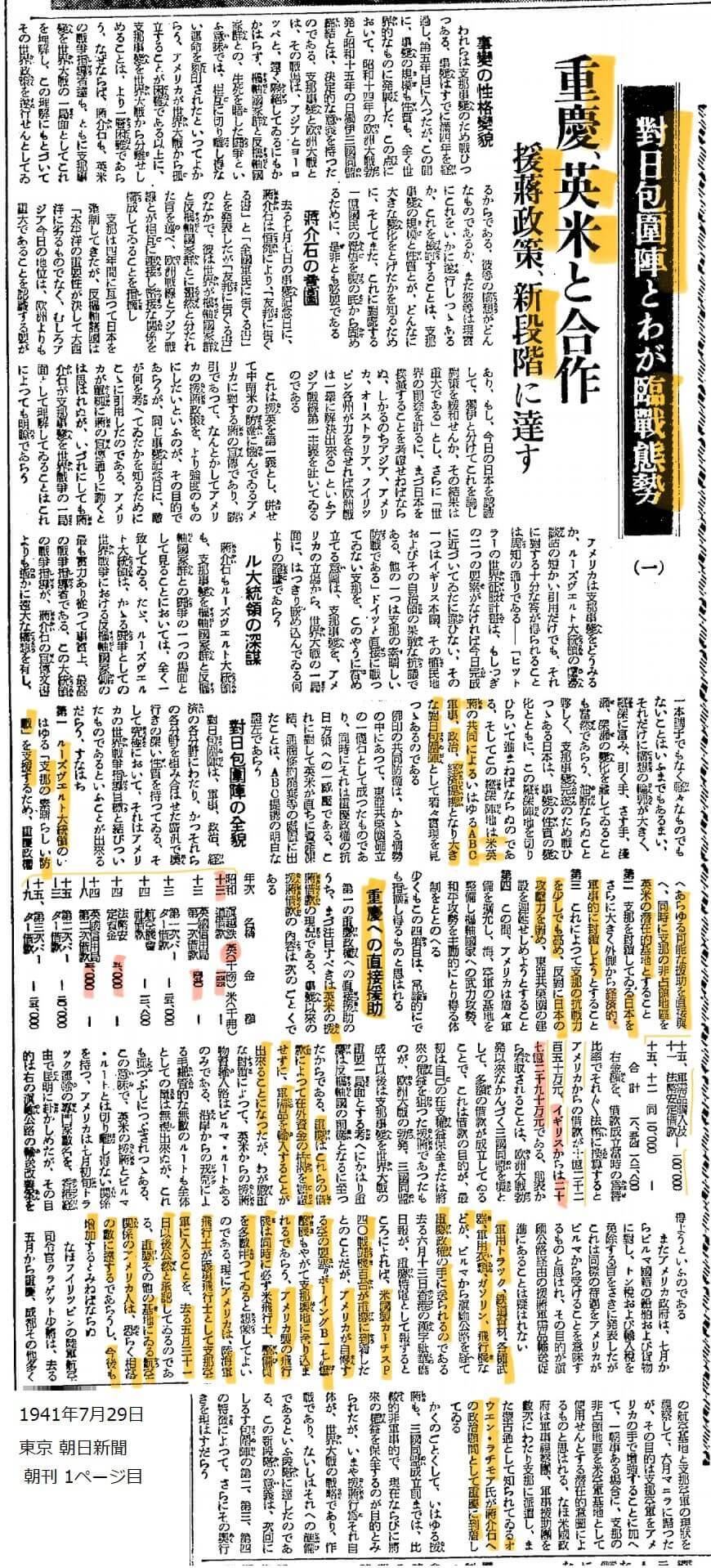 1941/07/29 Asahi Newspaper (beginning is omitted) President Roosevelt's Deep Plot Both Chiang Kai-shek and President Roosevelt were in complete agreement in viewing the Second Sino-Japanese War as a scene in the struggle between the Axis powers and the anti-Axis powers. President Roosevelt, however, was the most capable and, in effect, the best war leader of the anti-Axis powers in the world war as such a struggle. It goes without saying that the war leadership of President Roosevelt has a far grander concept than that of Chiang Kai-shek's propaganda, and is neither straightforward nor lighthearted. It is therefore not surprising that the contours of the plan are large, deep, and varied, and that there are many different pulls and changes in the shallows and depths of the sea. Japan, which is fighting to complete the Second Sino-Japanese Incident, must advance by opening up this deep-vertical position as the nature of the incident changes. This deep vertical position would be the so-called ABC (America British China) military, political, and economic alliance between the U.S., Britain, and Chiang Kai-shek, and was steadily being realized as a major encirclement of Japan. The joint defense by France Indochina was one of the cornerstones of the establishment of the East Asia Co-prosperity Sphere under these circumstances, and at the same time, it was an impetus to the anti-Japanese measures of the Chongqing regime. The fact that Britain and the U.S. immediately responded to this by freezing assets and canceling trade treaties is clear evidence of the ABC alliance. The Siege on Japan The siege against Japan is wide-ranging and profound in nature, spanning military, political, and economic fields and combining all of these fields. Ultimately, it can be said to be linked to the U.S. goal of leading the world war. In other words First. To provide all possible assistance directly to the Chongqing regime in support of President Roosevelt's so-called “Great Defense of China,” while at the same time making unoccupied areas of China potential bases for Britain and the U.S. Second. To attempt to blockade Japan, which has blockaded Shina, economically and militarily from an even greater outside distance. Third. To raise the war fighting capability of China as much as possible and, on the contrary, to weaken Japan's attack and delay the construction of the East Asia Co-prosperity Sphere. Fourth. During this period, the U.S. will steadily replenish its military forces, develop its naval and air bases, and establish a system that will enable it to take the lead in an armed offensive against the Axis powers and in a peace offensive. At least these four items can be pointed out even by common sense. Direct Aid to Chongqing The first item of direct aid to the Chongqing regime that deserves attention is the current status of the Anglo-American loan for aid to the Chongqing regime. The details of the loans to Chongqing since the Incident are as follows. (Omitted graph) The loan from the U.S. and the loan from the U.K. amounted to 1,022.5 million yuan (in ROC currency) and 2,729 million yuan, respectively, when the loan was converted into yen at the exchange rate prevailing at the time the loan was established. The purpose of the loans was initially to preserve the country's own interests in China or to provide assistance for the future interests of the country, but after the outbreak of World War II in Europe and the formation of the Tripartite Pact, the idea of Shina Jihen 支那事変 (2nd Sino-Japanese war) as an important phase of the World War II shifted, and the Chongqing Incident became a major factor in the war. However, after the outbreak of World War II in Europe and the formation of the Tripartite Pact, the idea that the Second Sino-Japanese War was an important phase of the world war was replaced by the idea that the Second Sino-Japanese War was an important phase of the world war, and Chongqing became the vanguard of the anti-Axis powers. Chongqing was able to import munitions without worrying about depletion of overseas funds through these loans, but due to our strict blockade, the import route for reinforcement supplies from Britain and the US was the Burma route. The numerous capillary routes from the coast by junks could not be ignored as a whole, but they were also being crushed with a fine-tooth comb. In this sense, there is an inseparable relationship between the Anglo-American aid to Chiang Kai-shek and the Burma route. In early July, the U.S. sent several trucking experts to Kunming via Hong Kong in order to obtain ideas on how to improve transportation along the Burma Road. The U.S. government also announced that from July, Burmese ships and cargoes would be exempted from tax per ton and import tax, which would mean that the U.S. would receive similar treatment from Burma. There is no doubt that the purpose of this was to promote the transportation of relief Chiang munitions via the 滇緬公路 (Burma Road). Military trucks, railroad materials, weapons, military clothing, gasoline, airplanes, etc. will be sent from Burma to the Chongqing regime via the 滇緬-burma road. According to a report in the June 13 issue of the Hong Kong-based Chinese newspaper “Huaqiao Nippo” (Chongqing Special Dispatch), one hundred US-made Curtiss P40 fighter jets have arrived in Chongqing, and the “Boeing B17” bombers, America's pride and joy in the sky, will also be sent to the interior of China in the near future. American-made planes must be sent to Chongqing at the same time as American planes. It is safe to imagine that American-made planes are always accompanied by a large number of U.S. aviators and maintenance personnel. In fact, the U.S. has openly approved the entry of Army and Navy aviators into the Chinese Air Force as volunteer airmen since May 31 of last year. The number of Americans in Chongqing and other air bases who are involved in aviation is probably considerable, and must 