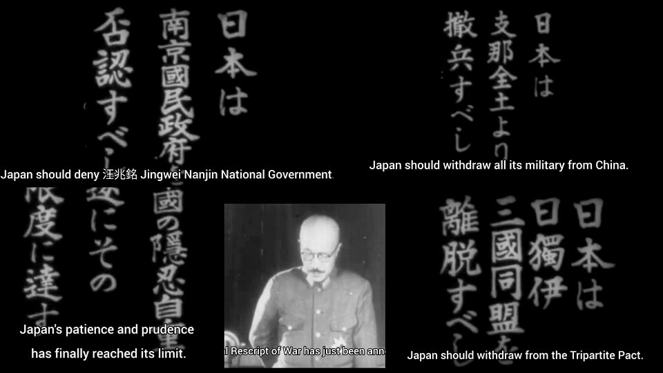 → Japan wouldn't accept Ultimatum because it meant accepting the defeat of 2nd Sino-Japanese war and betraying his ally, Wang Jingwei, who took a risk by taking Japanese side and would be arrested and executed by Chiang kai-shek.