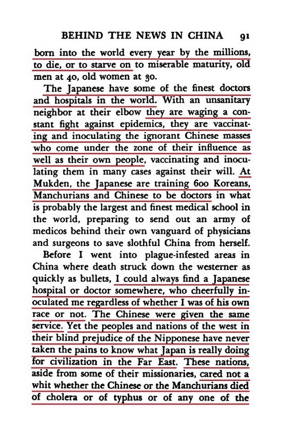 The truth is Japanese government was saving Chinese and Manchus in China with a medical care and vaccination, which is called “対支防疫事業(Tai shi bou eki ji gyou)” (Epidemic Prevention and Control Initiatives in China) with the organizations such as “同仁会 (Dou jin kai)”. Their activities and government budget record are archived as you can see here. Japan built hospitals in Manchuria where its population grew by Chinese immigrants since the time when it was still Japanese concession. See Manchoukuo.