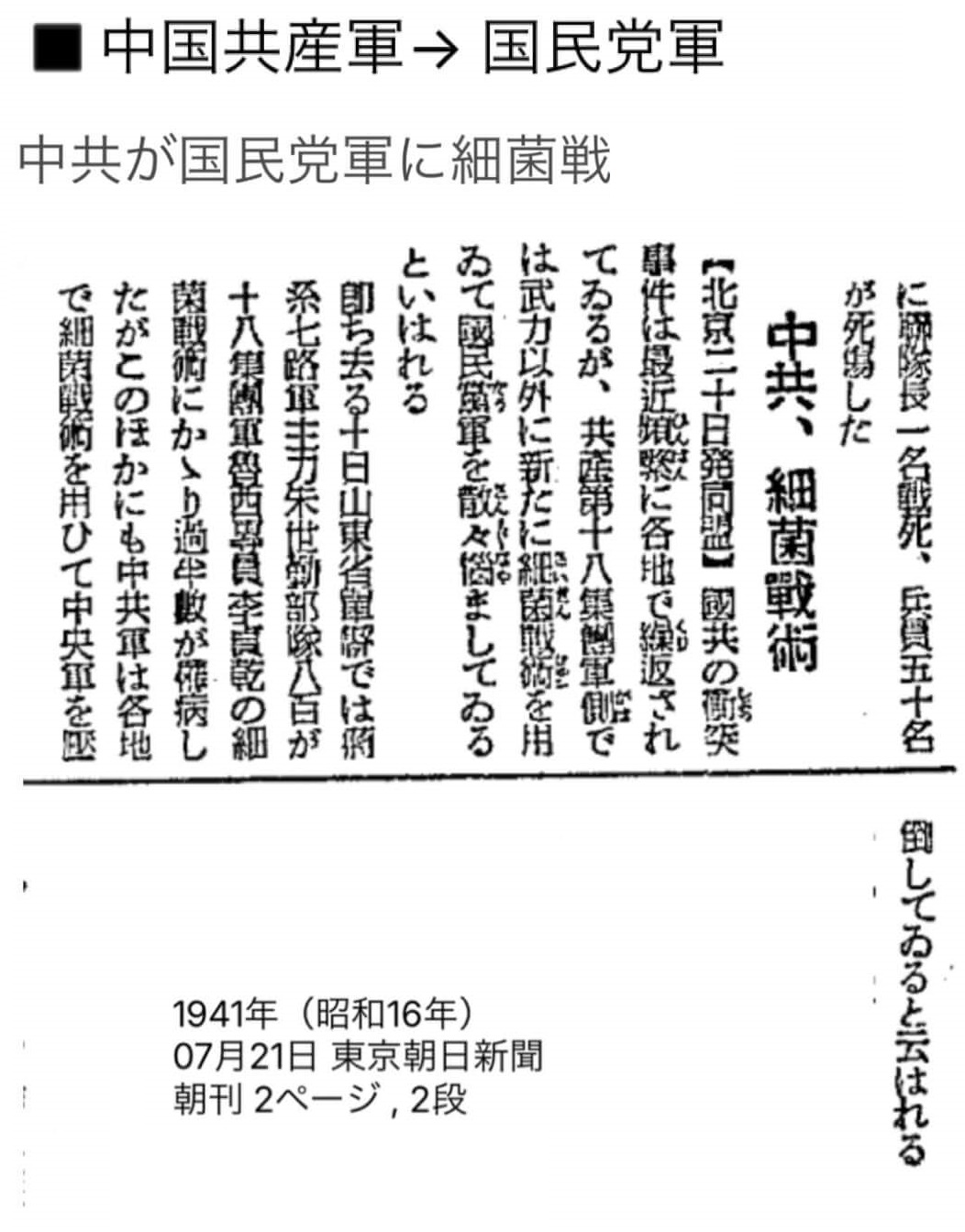 (Below) Interestingly, Japanese newspaper says Chinese communist was attacking Chinese KMT with biological weapons.
